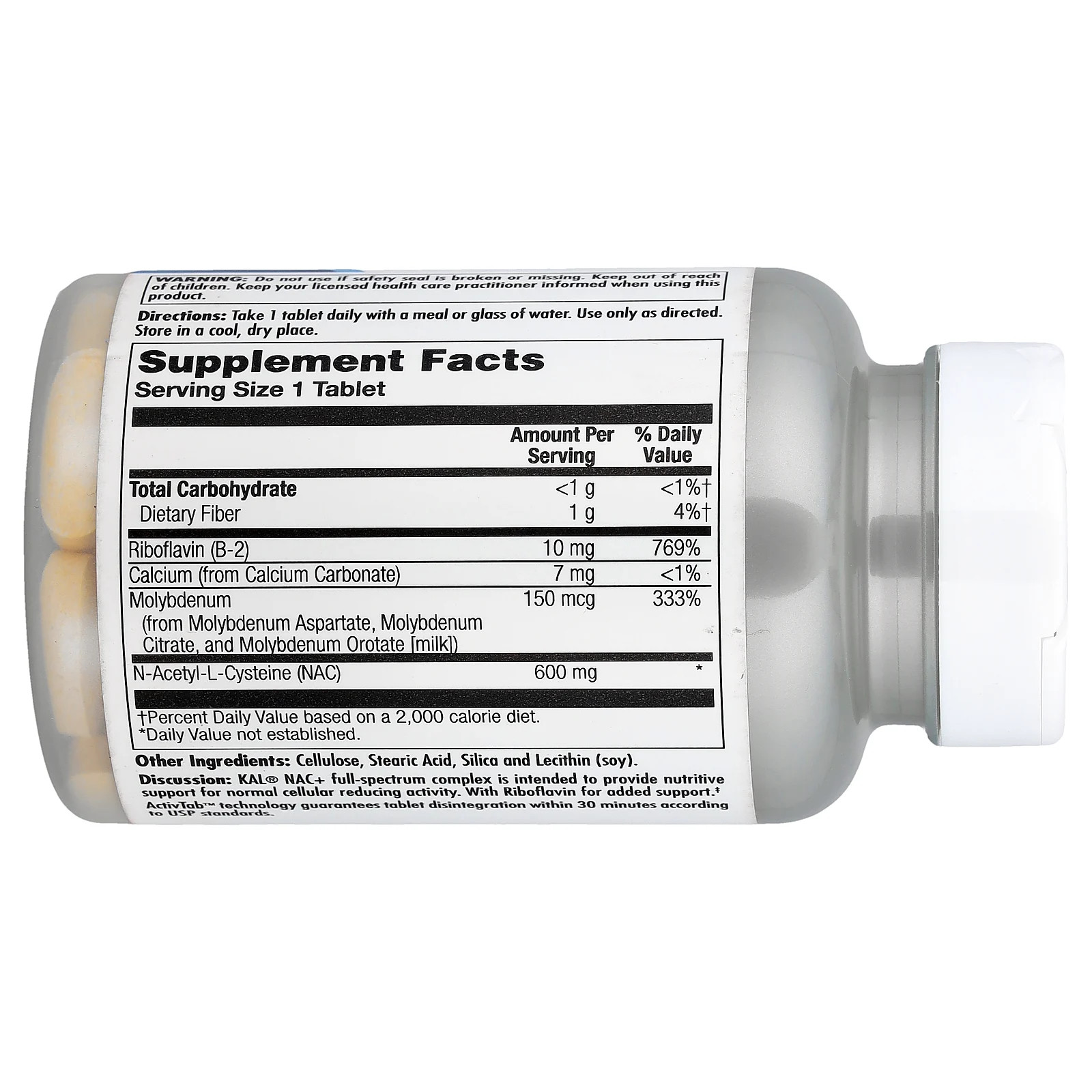 Since 1932 600 mg Trust Quality Dietary Supplement 1 Daily Cellular Health Non GMO Gluten Free Discussion: KAL® NAC+ full-spectrum complex is intended to provide nutritive support for normal cellular reducing activity. With Riboflavin for added support. ActivTab™ technology guarantees tablet disintegration within 30 minutes according to USP standards.