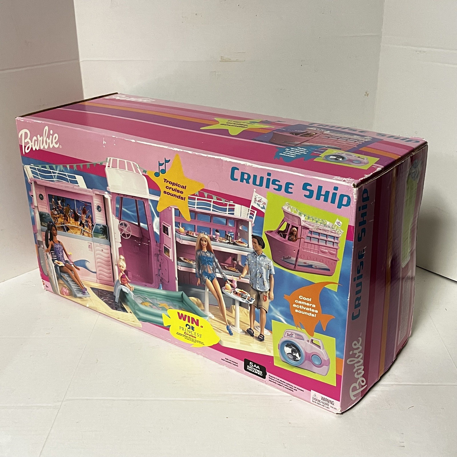 The product is a 2002 Mattel Barbie Cruise Ship with a tropical theme, still new in its original box. This Barbie vehicle, designed as a ship, is a collectible item perfect for Barbie enthusiasts and collectors. With its vibrant tropical theme and iconic Barbie branding, this cruise ship is a fun and whimsical addition to any Barbie collection.