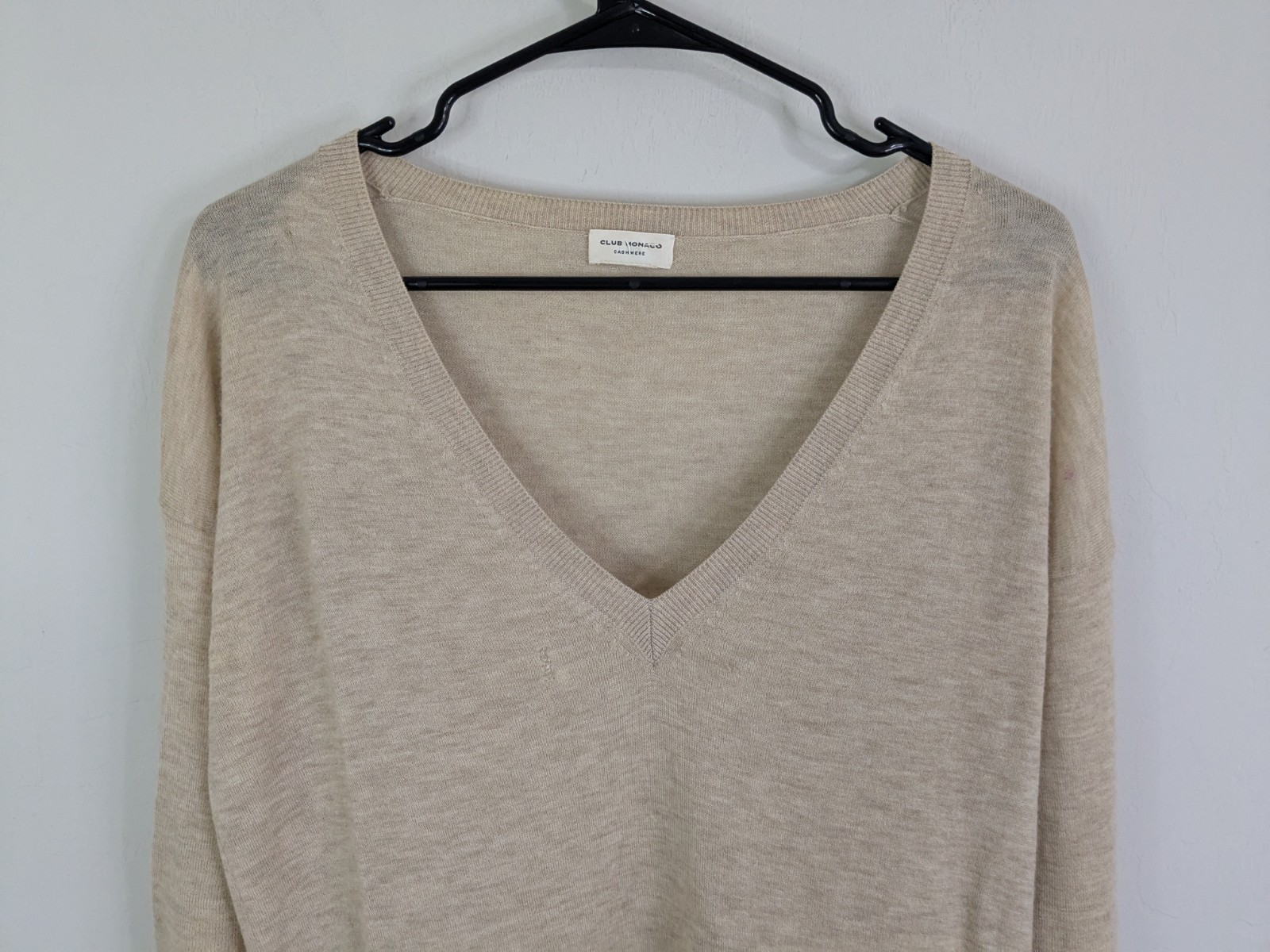 The Club Monaco Tunic Top in beige is a luxurious and stylish piece made of 100% cashmere. The v-neck design and long sleeves give it a classic and versatile look, perfect for any occasion. The tunic style adds a trendy touch, while the pockets add functionality. Ideal for women in size small, this blouse from Club Monaco is a must-have addition to any wardrobe. Does have a few tiny holes and a stitching as shown