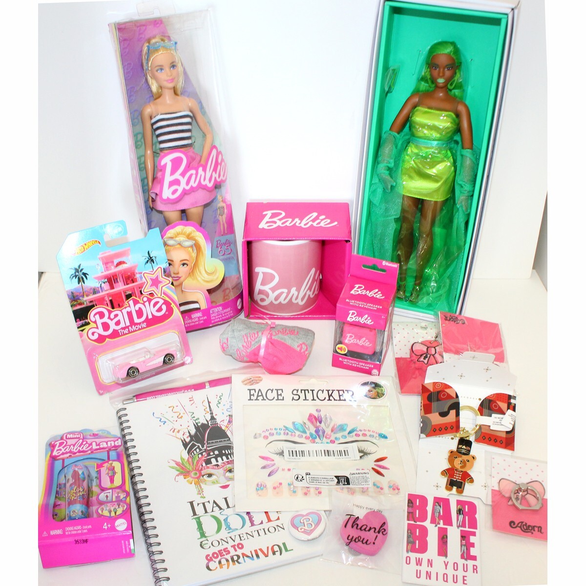 10th Italian Doll Convention Accessories - 2024 "Goes To Carnival" - Magia 2000. This set includes a Barbie mug, Chromatic Couture Barbie doll, a Barbie doll with blonde hair, travel mug, keychain, face stickers, mini Barbie Bluetooth speaker, Hot Wheels, pins, notepad & magnet!