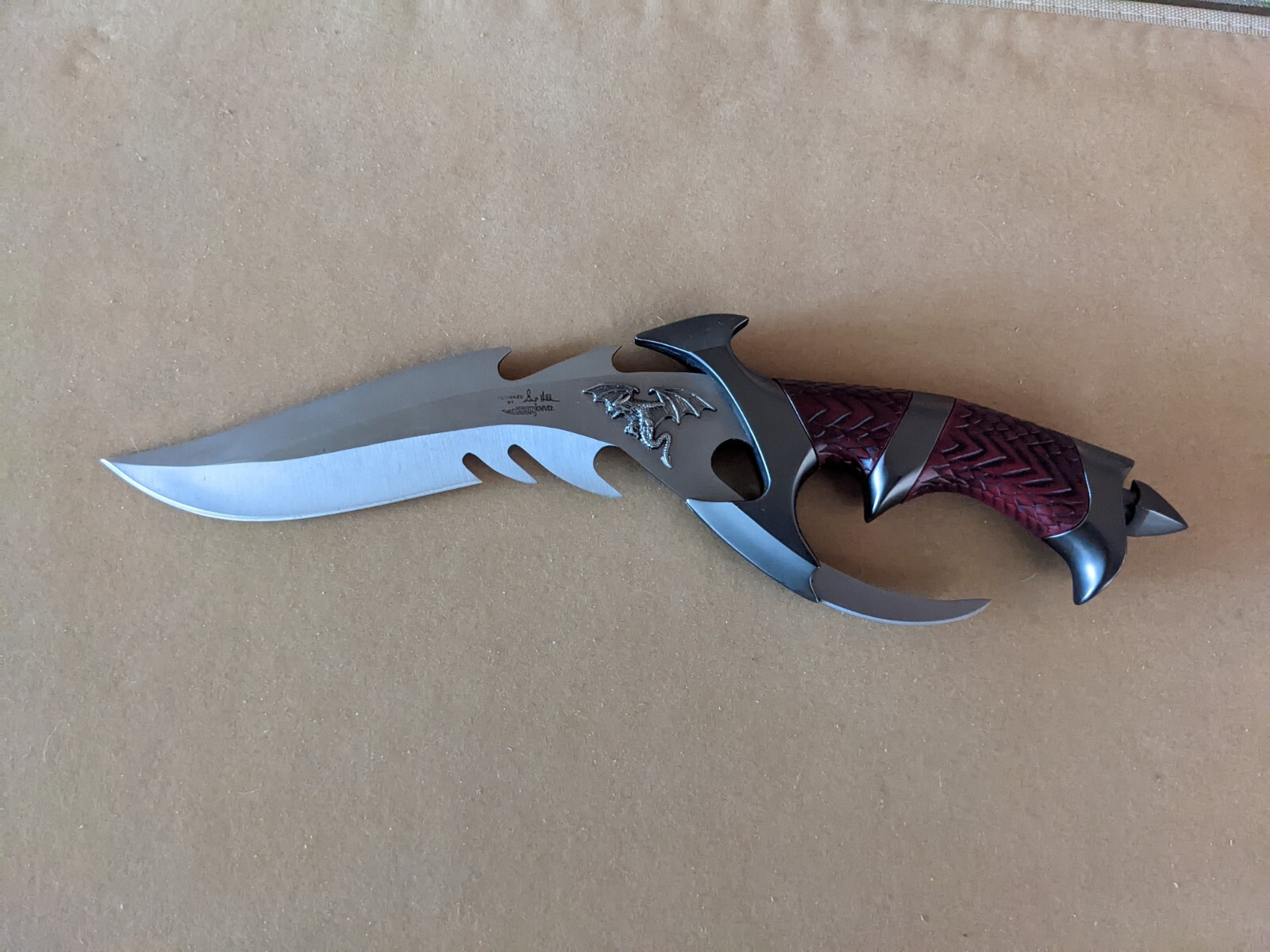 This Gil Hibben Dragon Lord Fantasy Knife is a must-have for any collector or fan of high-quality fixed blade knives. With its sleek design and durable construction, this knife is sure to impress. The brand Hibben is known for their top-of-the-line knives, and this one is no exception. This listing is for the knife only. There is no sheath.It was on display,never been used.
