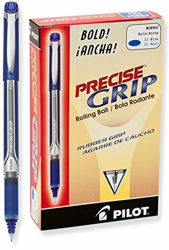 Precise Grip Rolling Ball Pens by Pilot feature a patented needle point technology for skip-free writing. Each pen has a dimpled rubber grip to provide writing control and comfort. The smooth writing liquid ink is water and fade resistant to keep your documents safe and clean. These pens come with 1.0mm bold point tungsten carbide tips and are available in a variety of colors (sold separately) to emphasize, organize, and color-code information. The barrel of each pen indicates the ink color inside as does the matching cap. An all-around quality pen - pick one up today! PEN GAME ON POINT: It doesn't matter if you're at school, at work, in the office, on the road or writing in a Bullet Journal at home, Pilot Precise Grip Liquid Ink Rolling Ball Pens are comfortable and flow smoothly & evenly in blue, black, red or purple.