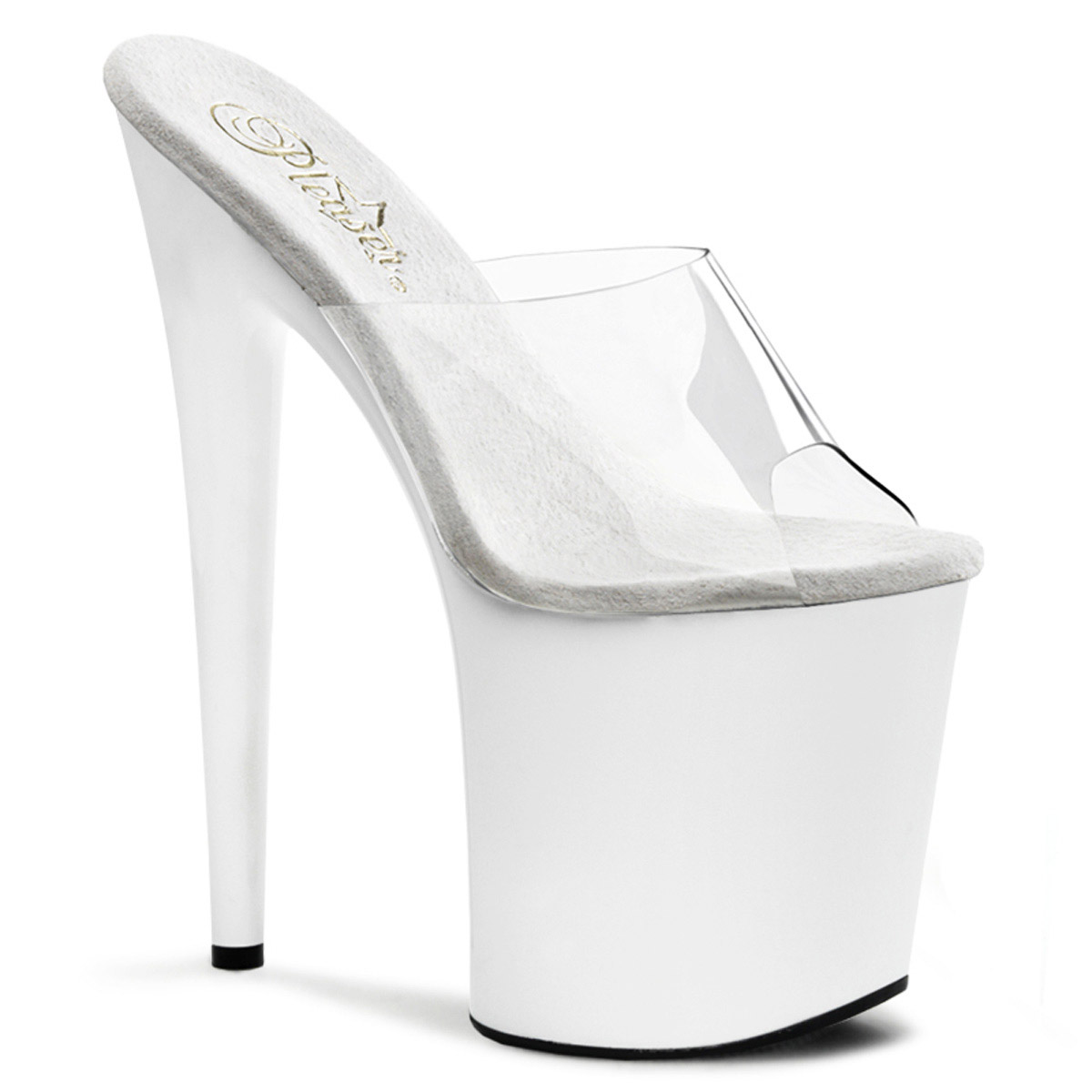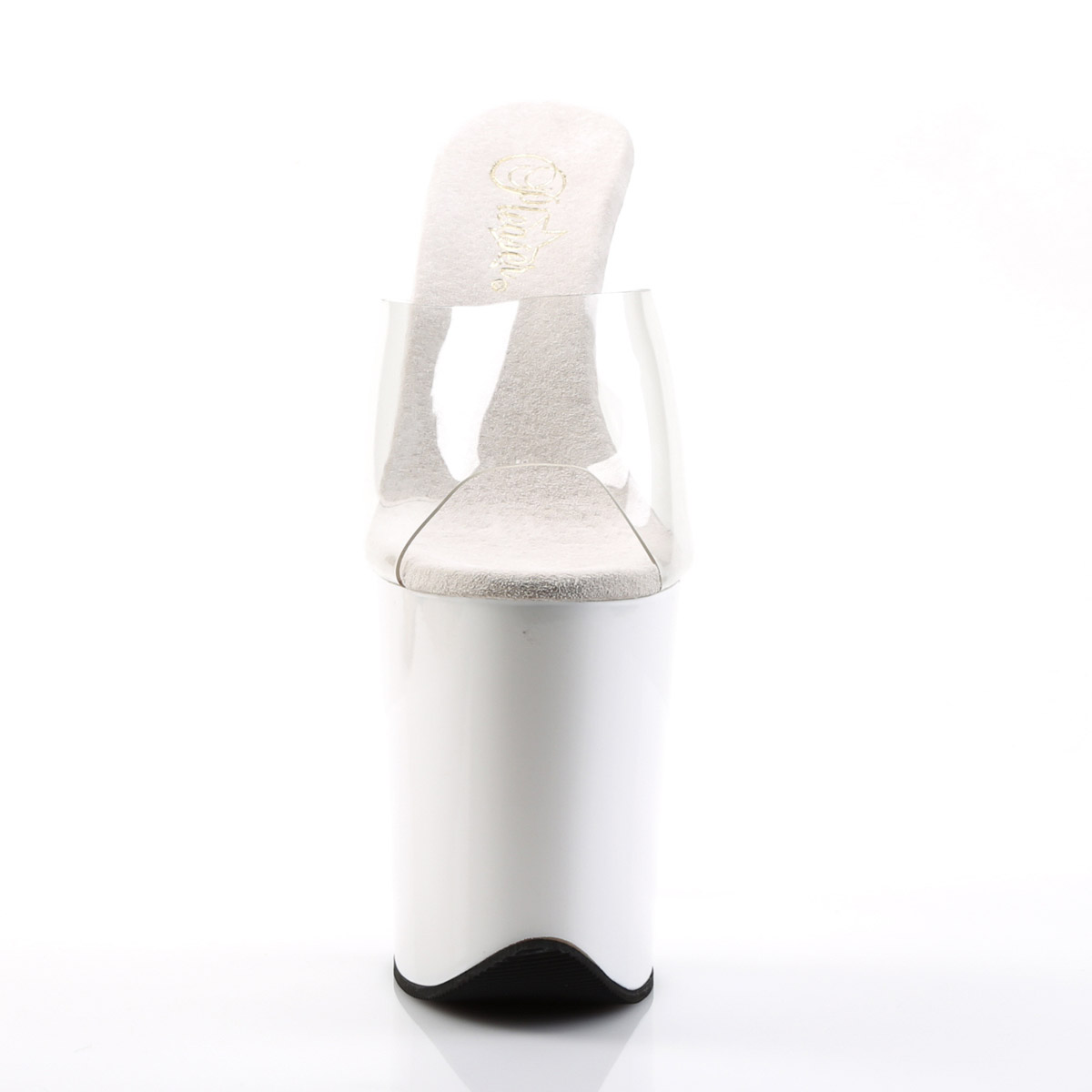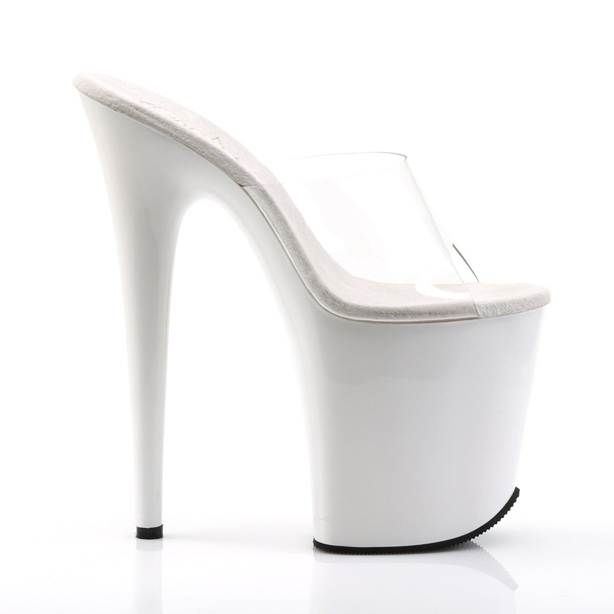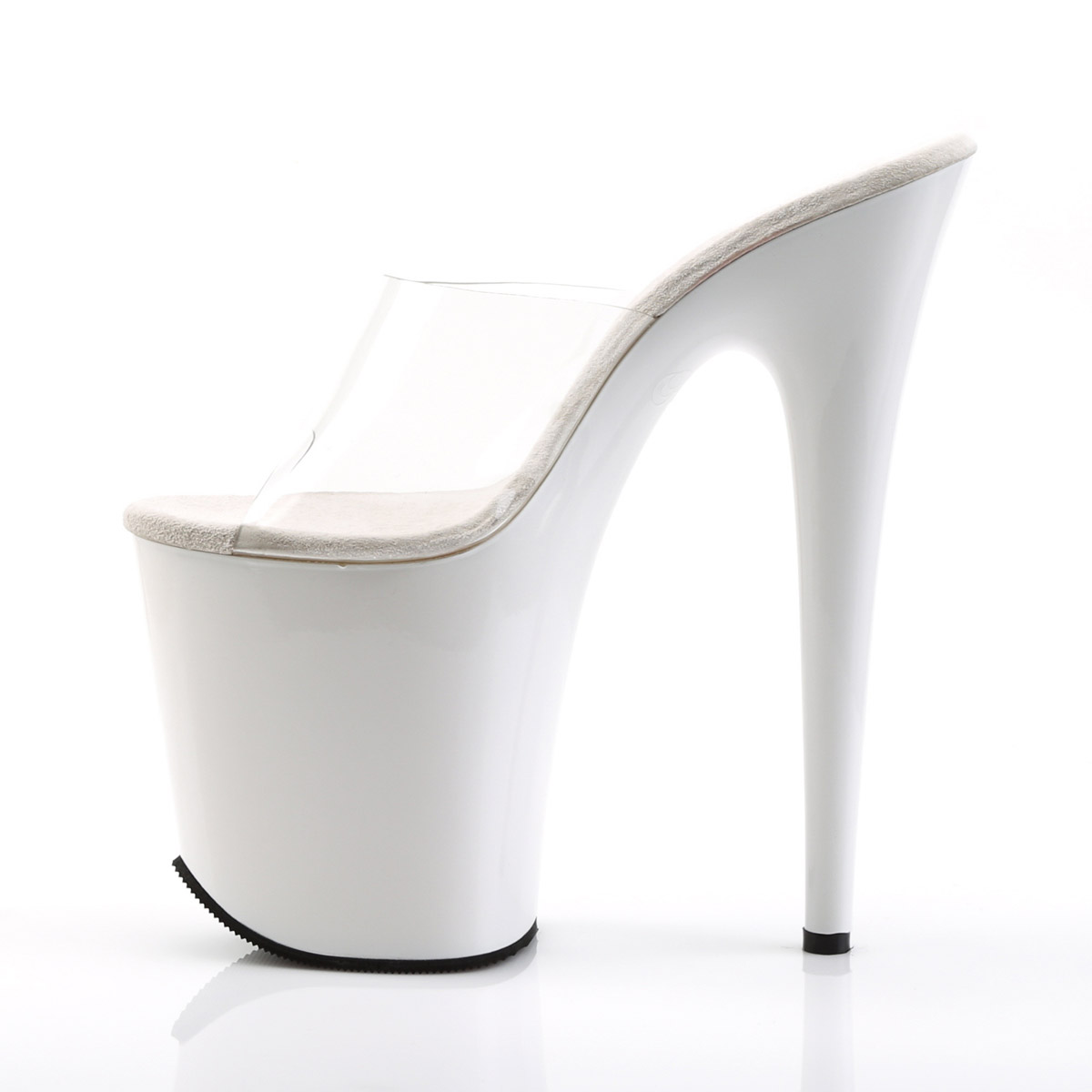 8" Heel, 4" PF Slide w/RS Detail on Bottom Clr/Blk-Pewter RS. There are no half sizes.