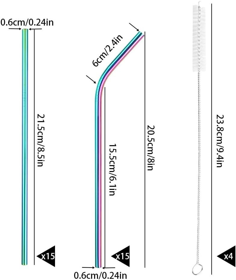 🍹 Juego súper valioso: 15 pajitas rectas (0,5 x 21,5 cm), 15 pajitas dobladas (0,5 x 20 cm) y 4 cepillos de limpieza.