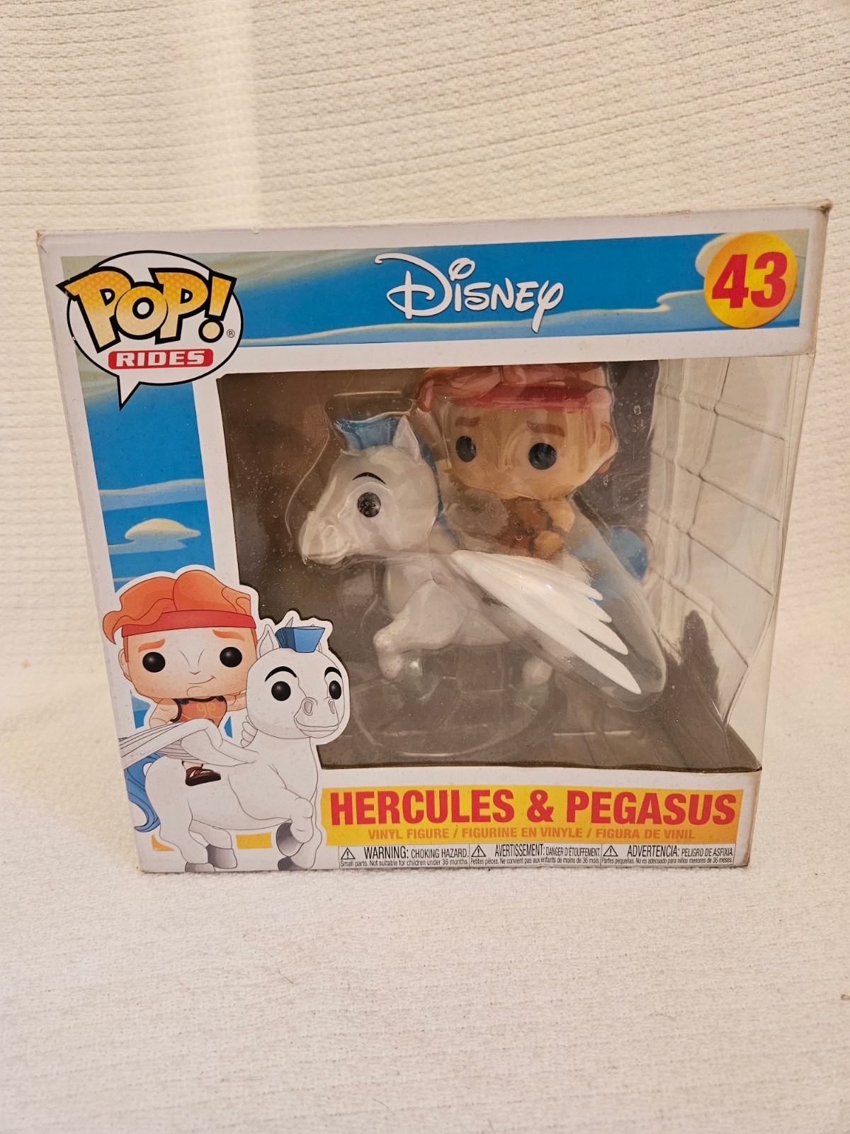 The Hercules and Pegasus Funko Pop 43 is a vinyl figure set from the Pop! Vinyl product line by Funko. This collectible features the characters Hercules and Pegasus from the Disney franchise, making it a must-have for fans and collectors alike. With its detailed design and iconic representation of these beloved characters, this Funko Pop is sure to enhance any collection of collectible figures and bobbleheads. The box is in bad shape but the figure is mint.