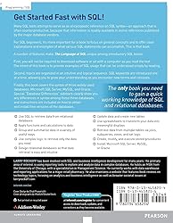 - The Language of SQL, Second Edition Many SQL texts attempt to serve as an encyclopedic reference on SQL syntax -- an approach that is often counterproductive, because that information is readily available in online references published by the major database vendors. For SQL beginners, it’s more important for a book to focus on general concepts and to offer clear explanations and examples of what various SQL statements can accomplish. This is that book. A number of features make The Language of SQL unique among introductory SQL books. First, you will not be required to download software or sit with a computer as you read the text. The intent of this book is to provide examples of SQL usage that can be understood simply by reading. Second, topics are organized in an intuitive and logical sequence. SQL keywords are introduced one at a time, allowing you to grow your understanding as you encounter new terms and concepts. Finally, this book covers the syntax of three widely used databases: Microsoft SQL Server, MySQL, and Oracle. Special “Database Differences” sidebars clearly show you any differences in syntax among these three databases, and instructions are included on how to obtain and install free versions of the databases. This is the only book you need to gain a quick working knowledge of SQL and relational databases. Learn How To... Use SQL to retrieve data from relational databasesApply functions and calculations to dataGroup and summarize data in a variety of useful waysUse complex logic to retrieve only the data you needUpdate data and create new tablesDesign relational databases so that data retrieval is easy and intuitiveUse spreadsheets to transform your data into meaningful displaysRetrieve data from multiple tables via joins, subqueries, views, and set logic Create, modify, and execute stored proceduresInstall Microsoft SQL Server, MySQL, or OracleContents at a Glance 1 Relational Databases and SQL 2 Basic Data Retrieval 3 Calculated Fields and Aliases 4 Using Functions 5 Sorting Data 6 Selection Criteria 7 Boolean Logic 8 Conditional Logic 9 Summarizing Data 10 Subtotals and Crosstabs 11 Inner Joins 12 Outer Joins 13 Self Joins and Views 14 Subqueries 15 Set Logic 16 Stored Procedures and Parameters 17 Modifying Data 18 Maintaining Tables 19 Principles of Database Design 20 Strategies for Displaying Data A Getting Started with Microsoft SQL Server B Getting Started with MySQL C Getting Started with Oracle