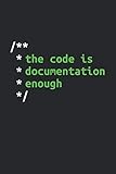 - THE CODE IS DOCUMENTATION ENOUGH is a perfect journal to take notes, ideas and thoughts as a Software Developer or Programmer who's developing and coding apps, applications, scripts and other cool computer poetry. Fill this notebook with all your ideas and memories and working notes as a planer. Use it to motivate yourself.Features of this journal:6 x 9" inches Softcover Journal Book120 matte pages (Lined)Useful size for all purposes, can be taken in your purse, handbag, carrying case, backpack