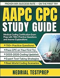 - Pass Your CPC Exam on the First Try With ConfidencePreparing for the Certified Professional Coder (CPC) exam can feel overwhelming. With 100 questions covering 17 knowledge areas and only 4 hours to complete the test, you need more than just coding books—you need a strategic study plan that works.AAPC CPC Study Guide 2026 provides exactly that. This comprehensive exam prep resource is designed around the actual CPC exam content outline, ensuring you focus your study time on what truly matters for exam success.700+ Practice Questions That Mirror the Real ExamTheory alone won't pass the CPC exam—you need practice. This guide includes over 700 carefully crafted questions with detailed answer explanations that teach you not just what's correct, but why it's correct. You'll work through three full-length practice exams plus hundreds of additional questions organized by topic.Your Complete Preparation Resource:✓ Comprehensive coverage of all 17 CPC exam knowledge areas✓ Strategic study plans for 8-week, 12-week, and 16-week timelines✓ Proven test-taking strategies for medical coding exams✓ Book tabbing techniques that save precious exam time✓ Real-world coding scenarios building practical skills✓ Current 2025-2026 coding guidelines and updates✓ Clear explanations making complex concepts accessibleWhat You'll Master:Medical terminology and anatomy for accurate codingICD-10-CM diagnosis coding with complex scenariosCPT® procedure coding across all specialtiesEvaluation and Management (E/M) codingSurgery coding for all major body systemsAnesthesia calculations and modifiersRadiology, pathology, laboratory, and medicine codingHCPCS Level II codingCompliance principles and ethical codingCareer Benefits:The CPC credential opens doors to careers in physician offices, hospitals, insurance companies, and remote positions. With 13% job growth projected through 2032 and average salaries exceeding $59,000 annually (experienced coders earn $70,000+), your certification investment pays dividends throughout your career.Why This Guide Works:No fluff. No filler. Just comprehensive, exam-focused content proven to help candidates pass. Every chapter builds expertise systematically. Every practice question prepares you for exam day. Every strategy saves you time and reduces anxiety.Thousands pass the CPC exam every year. The difference between success and struggle isn't talent—it's preparation. This study guide provides structured, comprehensive preparation that transforms knowledge into certification.Your Path to Certification Starts HereThe healthcare industry needs skilled, certified medical coders. Your expertise will impact patient care, operations, and your professional future. Everything you need to join certified coders is right here.Stop second-guessing your preparation. Start your CPC certification journey today. Scroll up and click "Buy Now" to build the coding career you deserve.