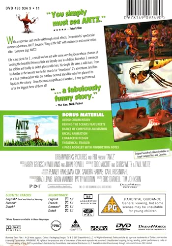 Antz is a 1998 American computer animated adventure comedy film produced by DreamWorks Animation and distributed by DreamWorks Pictures. It features the voices of well-known actors such as Woody Allen, Sharon Stone, Jennifer Lopez, Sylvester Stallone, Dan Aykroyd, Anne Bancroft, Gene Hackman, Christopher Walken, and Danny Glover as various members of an ant society. Some of the main characters share facial similarities with the actors who voice them.[2] Antz is the first animated film, as well as the first CGI-animated film, by DreamWorks Animation and the second feature-length computer-animated film after Pixar's Toy Story. The film premiered on September 19, 1998, at the Toronto International Film Festival,[3] and was released theatrically in the United States on October 2, 1998.