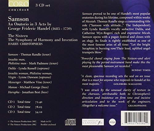 Samson proved to be one of Handel's most popular oratorios during his lifetime, composed within weeks of Messiah. Thomas Randle sings a commanding title role ("Samson with attitude...: The Independent), with Lynda Russell's vocally seductive Dalila, and Catherine Wyn-Rogers' rich and expressive Micah. Samson opens with a pagan festival and closes with an elegy. Its finale is rightly established as one of the most famous arias of all time" "Let the bright Seraphim in burning row/ Their loud, uplifted angel-trumpets blow."