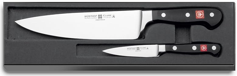 Basic knife collection covers most cutting needs Includes 8-inch cook's and pointed 3-1/2-inch paring knives Forged high-carbon stainless steel blades, hand-honed for razor-like sharpness Traditional-style composition handles are triple-riveted for strength and permanence Dishwasher safe; Made in Solingen, Germany