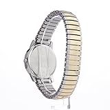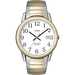 Easy to Read Dial: White easy-to-read dial with date window at 3 o'clock; full Arabic numerals Stainless Steel Expansion Band: Two-tone 18mm stainless steel expansion band fits up to 8-inch wrist circumference INDIGLO Backlight: INDIGLO light-up watch dial allows you to read the time in the dark with the push of a button Simplicity and Effortless Style: Two-tone 35mm brass case with mineral glass crystal Water Resistant to 30 Meters: Withstands splashes or brief immersion in water, but not suitable for swimming or bathing