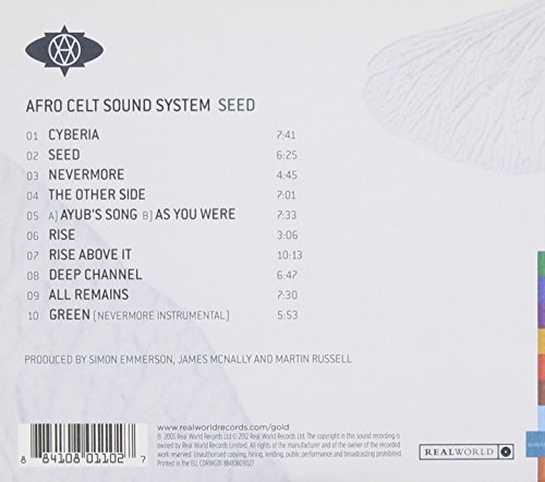 For their fourth album, the band dropped the "Sound System" from its name and became known simply as Afro Celts. In interviews, Simon explained that the collective had evolved into a true band, and as such the "Sound System" moniker - which implies DJs and samples to the exclusion of musicians and instruments - no longer applied. Still, reviewers' suggestions that the band had "gone acoustic" or that it had lost its interest in keyboards and beats were wildly overblown. To be sure, there is great emphasis on song craft and diverse instrumentation on Seed, but the programmed beats and ambient textures that marked the band's earlier efforts have not been eliminated altogether. Even the largely acoustic "Ayub's Song/As You Were" contains keyboard playing by Simon. In keeping with the "band" feel, Seed places a heavier emphasis on live bass (both acoustic and electric) and gives Johnny's, N'Faly's and Moussa's percussion greater prominence in the mix. The band lineup for Seed includes Simon Emmerson, James McNally, Iarla O'Lionaird (whose vocals are given much greater prominence than on the band's previous efforts), Martin Russell, N'Faly Kouyate, Myrdhin, Mass, Johnny Kalsi, Moussa Sissokho, and Emer Mayock.