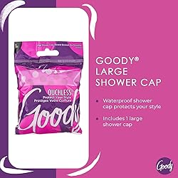 Goody Large Shower Cap: Protect your style with the waterproof Goody Hair Styling Essentials Shower Cap. Includes 1 large shower cap. Secure Fit: The secure fit keeps moisture and steam out to protect your hairstyle. Ouchless: Designed for comfortable, pain-free use. It’s All Goody: Generous size holds all volumes of hair. Goody: Goody knows that one little accessory can change everything.