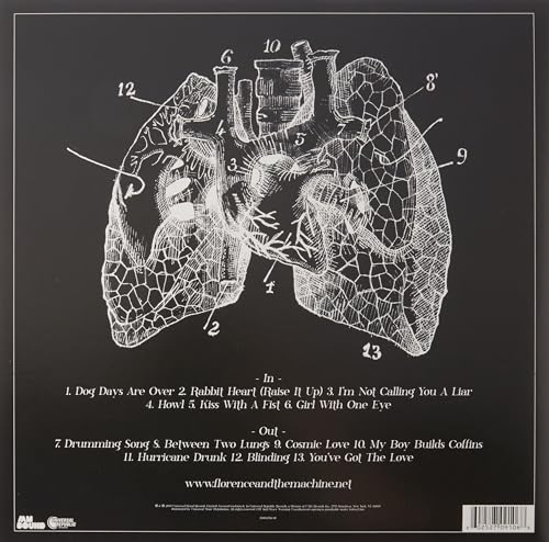 Personnel: Sally Herbert, Everton Nelson (violin); Bruce White (viola); Charlie Hugall, Isabell Summers, Florence Welch (drums, percussion). Audio Mixer: Chenzo Townsend. Recording information: Miloco; Space Cave; Strongroom 33; The Dairy Studios; The Garden; The Pool; The Smokehouse; The Synagogue. Illustrator: Orlando Weeks. Photographers: Tom Beard; Wade Fletcher. Precocious Brit Florence Welch fired a bullet into the head of the U.K. music scene in 2008 with the single "Kiss with a Fist," a punk-infused, perfectly juvenile summer anthem that had critics wiping the names Lily Allen, Amy Winehouse, and Kate Nash from their vocabularies and replacing them with Florence and the Machine. While the comparisons were apt at the time, "Kiss with a Fist" turned out to be a red herring in the wake of the release of LUNGS, one of the most musically mature and emotionally mesmerizing albums of 2009. With an arsenal of weaponry that included the daring musicality of Kate Bush, the fearless delivery of Sin?ad O'Connor, and the dark, unhinged vulnerability of Fiona Apple, the London native crafted a debut that not only lived up to the machine-gun spray of buzz that heralded her arrival, but easily surpassed it. Like Kate Bush, Welch has little interest (for the most part) in traditional pop structures, and her songs are at their best when they see something sparkle in the woods and veer off of the main trail in pursuit. "Kiss with a Fist," as good as it is, pales in comparison to stand-out cuts like "Dog Days Are Over," "Hurricane Drunk," "Drumming Song," "Rabbit Heart (Raise It Up)," and "Cosmic Love," all of which are anchored to the earth by Welch's knockout voice (which hopefully in time will lose the occasional Natalie Merchant affectation), a truly impressive and intuitive trio of producers, and a backing band that sounds as intimate with the material as its creator.