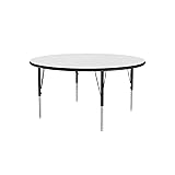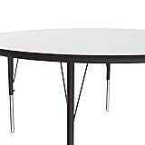 SIZE: Table Size is 42" round Legs easily adjust from 19" to 29" in height in 1" increments TOP: High Pressure Laminate resists scratch's, paint, markers, crayons, and food and juice stains far better than melamine DURABLE: Designed for the heaviest use in demanding environments such and schools and churches, The tables exceed the specs of all major brands. Superior features such as Backer Sheets to prevent warping, the strongest leg mounting in the industry, and free speed wrench for fast and easy height adjustments