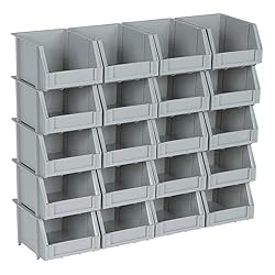 Ideal for storing nuts, bolts, and small parts Includes 20 molded mount bins, five wall mount brackets Reinforcement fingers create lip for hanging bins Bin size: 5'' x 4'' x 3''