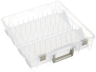 Spacious Design: The box has two removable trays that can hold various spools, including large 1500 yard spools. Versatile Storage: With 108 pegs, it can hold up to 224 20mm spools, 108 32mm spools, and 30 45mm spools, meeting all your thread needs. Compatible with ArtBin: Fits into the ArtBin Super Satchel Cube (6855SC) and Rolling Tote (6822AG) for complete storage solutions. Portable and Secure: Features 2 snap-tight closures and a sturdy handle for easy and secure transportation. Made in the USA: Proudly manufactured in the United States for quality assurance. Compact and Transparent: Measures 15.25 x 14 x 3.5 inches, with a translucent design for easy identification of contents; includes 2 removable thread trays.