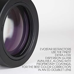 EXPERTLY MATCHED GLASS: The EvoStar series features a matched doublet objective including one synthetic fluorite element, providing excellent color correction for visual and photographic uses OUTSTANDING COLOR CORRECTION: Using the finest quality glass and proprietary Metallic High-Transmission Coatings (MHTC), EvoStar refractors produce tack sharp images with accurate color and minimal aberrations EVOLVES WITH SKILL: No need to replace this telescope as your skill set evolves. Whether you’re a seasoned astrophotographer or a budding novice, EvoStar refractors are versatile enough to use as your primary optical tube as your skill-set improves 10:1 DUAL-SPEED FOCUSER: No matter the eyepiece or camera, finding focus is a breeze with this 10:1 dual-speed Crayford-style focuser EVERYTHING YOU NEED: The EvoStar 100 comes complete with a foam-lined aluminum hard case, 8x50 Right Angle Correct Image (RACI) Finderscope, 2” Dielectric Diagonal, 5mm and 25mm LET Eyepiece, 1.25” Adapter, Mounting Rings and a V-Style Dovetail