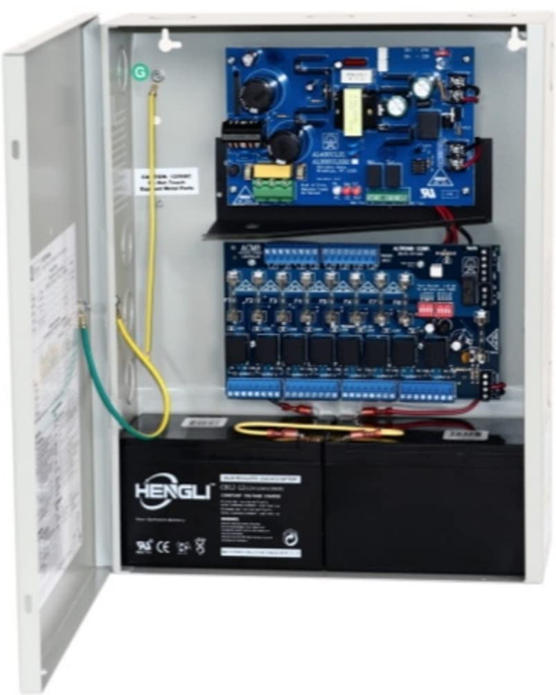 A Power Supply and Charger combination that converts a 115VAC 60 Hz input into eight independently controlled power limited fuse protected Fail-Safe and/or Fail-Secure outputs with a total of 12VDC @ 4 amp or 24VDC @ 3 amps of continuous supply current