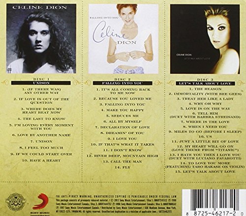 TRIPLE FEATURE includes the following 3 Celine Dion Studio Albums at a great Low Price: Unison, Falling Into You, Let's Talk About Love. This configuration features the 3 CD's in a slim Soft Pack.