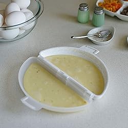 MAKE BREAKFAST IN MINUTES: Beat up to 3 eggs, add your favorite mix-ins, and microwave for a fluffy omelet in about 2 minutes. NONSTICK & OIL-FREE COOKING: No butter or oil needed—cooks evenly for healthier results. PERFECT FOR BUSY MORNINGS: Quick, convenient, and portable—great for home, office, dorm, or camping. EASY CLEANUP: Dishwasher safe for hassle-free washing after use. SAFE & DURABLE: BPA- and phthalate-free plastic. Measures 8.25" L x 4.5" W x 2.25" H.