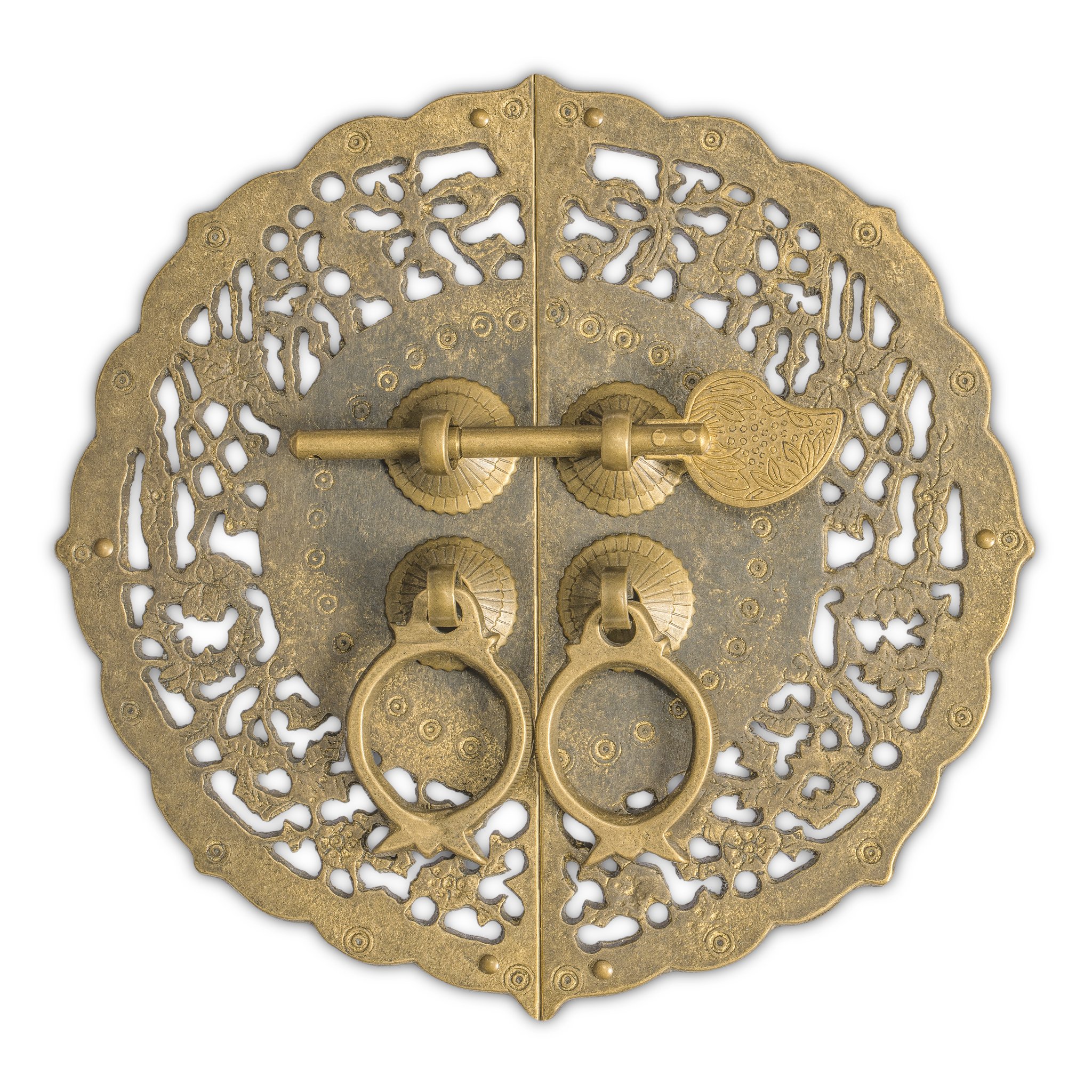 - Immerse your space in elegance with these ethereal brass hardware pulls. Adorned with enchanting Chinese flower motifs, the tab represents a bundle of blooming flowers, while the round plate mirrors the radiant sun. Transform your cabinets or chest drawers into a captivating focal point.
