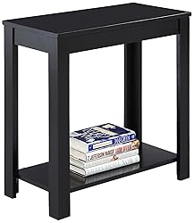 This Simple and clean lined side table fits any variety of purposes in your home. The shelf on the bottom provides additional storage. Black chair side table Wood Construction 24 x 12 x 24"H Color: Black