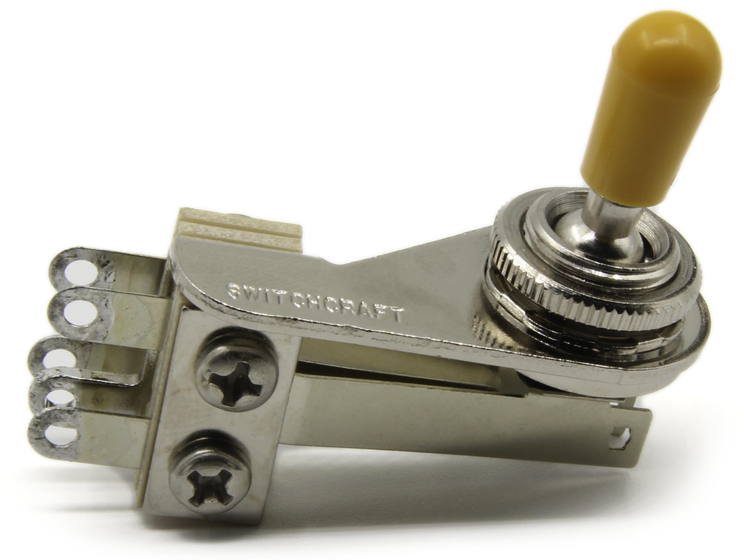 Interruptor de 3 vías de marco corto fabricado de calidad, fabricado en los EE. UU. por Switchcraft. Los conmutadores de marco corto son generalmente adecuados para su uso en guitarras de cuerpo estrecho o en forma de losa donde el botón de marco largo es demasiado largo. Por ejemplo: SG, serie ES, LP juniors, Epiphone LP. Se incluye una punta original de Switchcraft. Terminales preestañados para soldar fácilmente. Viene con una tuerca.