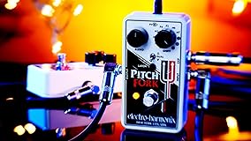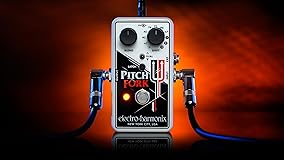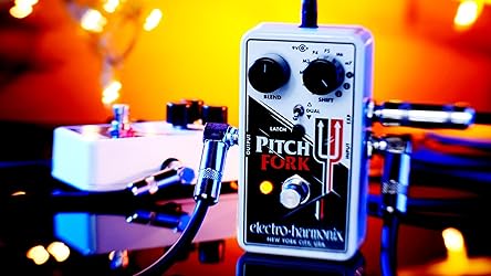 - The Pitch Fork transposes an instrument's pitch over a +/- three octave range and features three modes which allow the pitch to be transposed up, down or both, simultaneously. The pitch shift amount can be set to a fixed interval or continuously varied by an expression pedal or control voltage. The controls are straightforward and intuitive. An 11-position Shift switch selects the maximum transposition interval ranging from D (Detune), a shift of 17 cents, through Minor 2nd, Major 2nd, Major 3rd, Perfect 4th, Perfect 5th, Major 6th, Minor 7th, 1 Octave, 2 Octaves and 3 Octaves. A three position toggle switch controls whether the pitch is transposed up, down or both. In Dual mode, two pitch-shifted signals are output. One follows the shift knob as if in the Up position while the other creates a harmony. Dual Mode settings include M3 up + P5 up, P5 up + 1 Oct down, 1 Oct up + 1 Oct down and many others. A Blend knob controls the mix of the dry signal and the effected signal, and an EXP jack enables the player to control pitch and glissando with an expression pedal. Latch or Momentary mode affects how the footswitch and EXP input behave. In Latch mode, the footswitch toggles between on and off each time it's pressed and the EXP input continuously varies pitch. In Momentary mode the effect is only on while the footswitch is depressed and when it is released the Pitch Fork goes into bypass. In Momentary mode the EXP input controls glissando rate for the Pitch Fork's footswitch. When the bypass footswitch is pressed, the Pitch Fork jumps from bypass to the interval set by the Shift knob. The amount of time it takes to reach that new note is the glissando rate. When the footswitch is released the pitch will return to unity at the same rate. That glissando time can vary between 4 milliseconds to two seconds depending on the heel/toe position of the expression pedal. The Pitch Fork comes equipped with an EHX 9.6DC-200 mA power supply and also runs on a 9 Volt battery.
