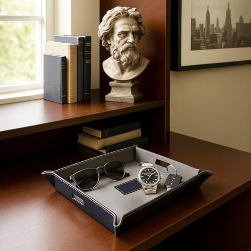 - Display-Ready Accent and Gift Choice: The navy leather exterior and tailored silhouette complement modern, classic and minimalist décor, whether you style it on a nightstand, office desk, entryway console or dresser. Presented as a refined nightstand tray or dresser organizer, it makes a thoughtful gift for birthdays, Father’s Day, graduations, promotions or housewarmings for anyone who appreciates a well-organized space.