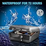 FIREPROOF: Safe is UL classified for ½ hour at 1550°F, keeping valuables safe while emergency responders address the situation WATERPROOF: Safe is ETL verified for 72 hours of water submersion offering peace of mind in the event of a flood COLOR: The fireproof box for home has a gray and black exterior finish MEASUREMENTS: The exterior is 16.5 inches W x 14.8 inches D x 7.6 inches H and the interior is 12.6 inches W x 9.2 inches D x 5.4 inches H, safe has large capacity at 0.36 cubic feet and weighs 24 pounds KEY LOCK: The lid of the small safe includes a tubular key lock for added security and to prevent the lid from opening in the event of a fire; Includes 2 keys DOCUMENT SAFE: Portable safe holds A4-sized paper and contains straps to easily stash and find social security cards, passports, birth certificates, and other critical records