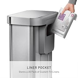 NEAT AND SECURE - Stainless steel liner rim flips up for a quick and easy liner change, then closes over the liner to hold it tightly in place and keep it hidden from sight. LINER POCKET - Keep liners where you need them. Dispense them one by one — no perforations or unraveling — from inside the can for a faster liner change. FINGERPRINT-PROOF COATING - The can's stainless steel surface is protected by an invisible fingerprint-proof coating STRONG WIDE STEEL PEDAL - simplehuman's extra-wide steel pedal is engineered to last 150,000 steps — that's more than 20 steps a day for 20 years. SILENT CLOSE LID - simplehuman's patented lid shox technology controls the motion of the lid for a slow, silent close.