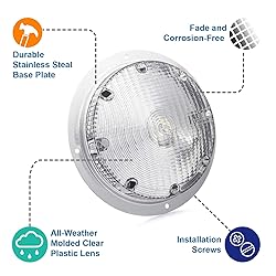 Type: Surface mount scare light with mounting gasket Design: Durable and elegant stainless steel base plate Features: All-weather molded clear plastic lens prevents corrosion Bulb: LED Bulb Type 1156 - 122 lumens, 2.1 Watts, 12 Volts Specifications: 8.66" Diameter; 2" Deep; 6" Lead and ground wire. Mounting screws included