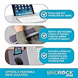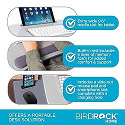 SPACIOUS WORK SURFACE: Enjoy ample space for all your tasks with a large work surface measuring 18.5" x 14" x 3.5". Whether you’re working on a laptop, tablet, or handling paperwork, this desk provides the room you need for an efficient workspace. VERSATILE DEVICE SLOTS: Equipped with a convenient tablet slot that fits devices up to 9.6 inches and a smart phone slot for devices up to 3.5 inches, ensuring your essential tech is always within easy reach while you work or study. COMFORTABLE DESIGN: Designed for long hours of use, this lap desk features a memory foam cushion that provides comfort and support. The built-in wrist rest reduces strain, and the handle makes it easy to carry, enhancing your work-from-home experience. SLIDE-OUT MOUSE DECK AND PORTABILITY: Boost productivity with the slide-out mouse deck, usable on either side. This portable workstation adapts to your lifestyle, ideal for working from your couch, bed, or outdoors, and suits both left and right-handed users. STYLISH COLOR OPTIONS: Available in two elegant finishes to match your personal style and home decor. Choose from a sophisticated Wood Top in Black or a sleek Silver finish, ensuring that your workspace is both functional and aesthetically pleasing.