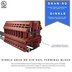 - Dinkle DK4N-RD red color block has a compact design that saves wiring space. The high reliability and robust design adapts vibration and harsh thermal variation to prevent terminal connection fault. Rated voltage: UL 600V, IEC 1,000 V. Rated current: UL 30A, IEC 32A. Conductor cross-section, solid(AWG/mm2): UL 22-10, IEC 0.5-4. Conductor cross-section, flexible(AWG/mm2): UL 22-10, IEC 0.5-4. Rated impulse withstand voltage: 6KV. Torque(N-m): 0.6. Screw: M3. Wire strip length: 9-11mm. Insulating material: PA. TxHxW(mm): 6.1 x 39.6 x 40.3. End cover DK4NC-RD. Partition DKNSPS-005. Jumper DSS4N-02P, DSS4N-08P, DSS4N-10P. Marking label TM10W, TM27W.