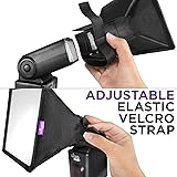- Flash Diffuser Light Softbox by Altura Photo (Universal, Collapsible with Storage Pouch) for Canon, Yongnuo and Nikon Speedlight Altura Photo's Softbox Diffuser is the top selling light modifier for shoe mount flashes. Its high-quality diffusion material and reflective silver interior lining produces a soft evenly spread light that minimizes harsh shadows. Its compact design, ease of use, and affordable price makes it the perfect accessory for everyone's gear bag. Ideal for a variety of situations including indoor events, portraits, macro, food photography and more. We guarantee that this will be the best diffuser you will use or we will take it back with our 90-Day Satisfaction Guarantee. Includes: 1 x Altura Photo Universal Softbox Diffuser for Shoe Mount Flashes (6" x 5"), and Carry Pouch Features: - Fits most on-camera shoe mount flash units. - Includes 2 layers of diffusion for a more softer quality of light. - Pro grade reflective silver interior maximizes light output. - Rubberized mounting grip holds your diffuser in place. - Elastic hook and loop fastener strap provides a secure fit around the flash head. - Collapsible and portable design; easily fits into any gear bag. - Constructed from durable & high quality materials for long lasting use. - Soft Box Size: 6" x 5" inches Compatibility: - Compatible with most shoe mount flashes including: - e.g. Canon 430EX II 580EX II 600EX-RT - e.g. Nikon SB-900 SB-910 AF SB-800 AF SB-700 - e.g. Yongnuo YN560 II YN560 III YN560 IV - Also, compatible with Sunpack, Nissin, Sigma, Sony, Pentax, Olympus, Panasonic flashes.