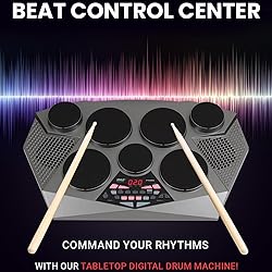 COMPLETE DRUMSET SOUND: This electronic drum kit has 7 drum pad and hi-hat and kicks bass drum digital pedal controller to reproduce full drumset sound with tom-toms, hi-hat, snare, crash and ride cymbal perfect for professional and beginner PRESET DRUM KITS: Pyle portable electric tabletop drum set machine comes packed with 55 preset plus 10 custom preloaded drum kits, 300 plus cymbal or drum sounds, and it also has a drum trainer learning mode for beginners/starter DIGITAL CONTROL PANEL: The drums digital top panel control center comes equipped with an LCD screen and a ton of audio configuration controls that will allow you to create, record, and edit some truly unique and customizable music CONNECT TO MAC AND PC: connect the table drum to your computer using a USB cable to act as a MIDI Connection for your favorite desktop software. it also has an AUX in jack for connecting other devices and a phone out jack for amplifiers of headphone PLAY THE DRUMS ANYWHERE: This portable drum kit is powered by the included AC adaptor or you can go wireless and runs on (6) x ‘C’ battery so you can take it wherever you go and it comes with drumsticks which are perfect for drumming practice