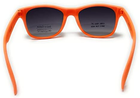 Fun Shades for Kids in a classic retro style shape! Lots of great colors to accessorize for the outdoors--or to just look cool! High Impact Plastic Frame which is sturdy and well built yet light weight and comfortable. This Classic shape looks great on boys or girls. Enjoy the Classic Solid Colors with rubberized material frames with matte finish. Although these are very basic glasses they offer excellent protection from the sun. They are rated at UV400 Protection--which is said to be 100% protection from UVA and UVB rays. Kids are pretty rough with glasses. These entry level glasses won't make you cry if they need to be replaced. Recommended to clean lenses with a soft cloth and never paper towel. Abrasive material may scratch the lenses. Have some fun with these glasses. Look sharp at the park, riding bikes or maybe everyone at a party could get a pair as a party favor--or to participate in a skit together. Everyone will look cool! Again, these are great quality for a very "entry level" price.