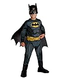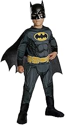 - Transform your little one into Gotham’s defender with the DC Comics Batman Costume for Kids by Rubies This officially licensed outfit features a sleek black jumpsuit with printed muscles and the iconic black and yellow Batman logo. It includes a removable black cape, utility belt, and Batman mask for an authentic look. Perfect for battling villains or soaring through the night, this costume is ideal for Halloween, themed parties, or everyday dress-up fun. Watch your kiddo embrace their inner Dark Knight, saving Gotham one adventure at a time. Ready for action and full of superhero spirit, this Batman costume is perfect for any little hero.