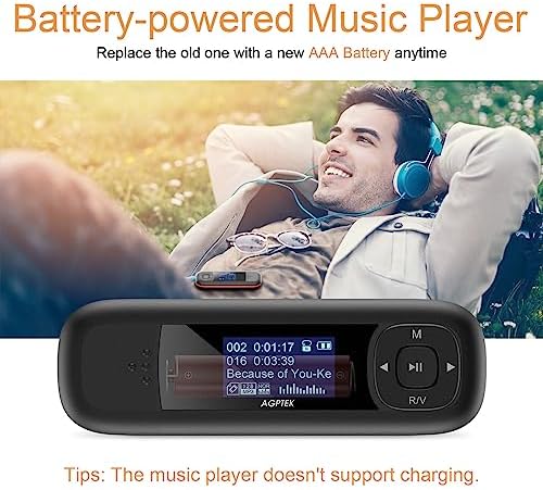 • BATERÍA REEMPLAZABLE: Nunca te preocupes por la energía, reemplázala en cualquier momento con 1 pila AAA (no incluida). La capacidad de la batería de diferentes marcas puede influir en la duración de la batería del reproductor. NOTA: La batería reemplazable debe estar fuera del dispositivo para transferir archivos. El icono de la batería se mostrará vacío después de aproximadamente 10 horas, pero aún puede funcionar durante algunas horas.