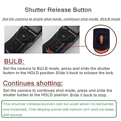 ✔ It sports an electric sound speaker, shutter release active lamp, interval timer, long exposure (it can use interval timer and long exposure simultaneously), self timer, TIME exposure and a release hold mechanism. Take photos without touching your camera and take pictures at regular intervals for time-lapse projects ✔ Timer functions can be set to 99 hours 59 minutes and 59 seconds in one second increments. Number of shots can be set from 1 to 399; Double dash ( - - ) unlimited. LCD display with backlight and status LED with alarm. A locking two stages shutter button (BULB) ✔ Compatible with Panasonic S5, S5C, S5M2, S5M2X, S5M2N, S5M2XN, S5DN, S5DH, S1H, S1RM, S1R, S1M, S1, G95, G91, G91H, G91M, G90M, G90H, G90, FZ10002, G9, G9L, G9M, G9M2M, G9M2L, G9M2, GH5, GH5L, GH5S, GH5M, GH5M2, GH5M2L, GH5M2M, GH6, GH6L, GH6M; G85, G81M, G81H, G81, G80M, G80, G70H, G70M, G70KA, G70W, GX8M, GX8A, GX8H, GX8, GX7, GX1, GH4RH, GH4R, GH4, GH3, GH2, GH1, GF1, G10, G7H, G7K, G7M, G7, GH7, GH7L, GH7M, G6H, G6K, G6M, G6, G5, G3, G2, G1; FZ2500, FZ2000, FZ1000, FZ1000 II, FZ330, FZ300, FZ200, FZ150, FZ100, FZ50S, FZ50K, FZ50, FZ30K, FZ30, FZ20S, FZ20K, FZ20 ✔ Compatible with Leica DigiLux 2, DigiLux 3, V-Lux 4. Replaces Panasonic DMW-RSL1 and DMW-RS2