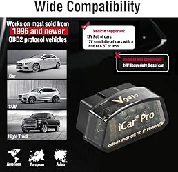 ⚠️NOTE: We Vgatemall DO NOT au-thorize the sel-ler "Happy Lucky Land" to sell our Vgate products, and we are not res-ponsible for the af-ter-sale ser-vice of the products purchased from this sel-ler. ● CAR COMPATIBILITY - 12V petrol vehicles made in the U.S. compatible with standard OBD2 protocols after 1996, 12V Light diesel vehicles with a load of 6.5T or less supporting the OBD2 protocols after 1996. Do not use on a 24V power diesel cars. ● SIMPLE OPERATION - Compatible with iOS (no Bluetooth pairing needed; connect in the app) & Android devices. No complex settings or tricky connections plus much lower power consumption compared to WiFi OBD2 code reader, and it does not block internet access for other apps. ● LOW POWER CONSUMPTION - Vgate iCar Pro Bluetooth 4.0 adapter supports auto sleep & auto wake and consumes as low as 3MA when sleeping, which helps save car battery power. Note: auto wake for electric and hybrid vehicles is not supported. Requires reinsertion to wake up. ● SMALL COMPACT DESIGN - Easy to plug in and unplug in your car OBDII port. The majority of cars made in the past 2 decades are fitted with an OBD2 diagnostic port, simply find the port and plug the Vgate iCar Pro Bluetooth in. ● SUPPORT UPGRADE - Support for upgrading product firmware on phones and Windows PC. Please contact Vgatemall team. ● WORK WITH MANY OBD2 APPS - Vgate iCar Pro Bluetooth Low Energy device works with most popular OBD apps such as Torque, Car Scanner, OBD Fusion, OBD Jscan, BimmerCode, etc which can turn your iPhone or Android phone/tablet into a sophisticated car scan tool. NOTE: Fee in Apps.