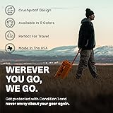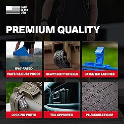 Polypropylene Copolymer Made in US CONDITION 1 HARD CASE - The large hard case with foam is injection molded to be lightweight whilst being virtually indestructible. An ideal tactical case for tactical gear, tool case, camera case, travel case, scientific equipment, and more. P67 DUSTPROOF AND WATERPROOF CASE - Condition 1 hard cases are IP67 rated waterproof and dustproof to protect against the elements, the ideal waterproof hard case. LARGE CASE LUGGAGE - The protective case can be taken on airlines, measuring 21.84" x 13.82" x 9" to the exterior, interior measures 19.66" x 11.18" x 7.5". TSA Approved GORE-TEX Automatic Air Pressure Valve. The travel hard case also comes with a retractable handle. OFF-ROAD STYLE WHEELS - Rubber all terrain tread wheels on this rolling hard case offer great stability and prevent vibration. The portable hard case has steel pin hinges to add overall strength and stability to the case. LOCKABLE STORAGE CASE - The lock ports allow the lockable storage containers to be secured with a padlock. Patented latches on the plastic hard case can be closed with just one finger.