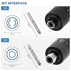 [Comfortable handle]: The handle of this screwdriver is of ergonomic design, which is comfortable to hold and can make users woke long hours without fatigue. Anti-slip strips on the handle can increase cushioning and save effort. [One-key forward and reverse switch]: There is a forward and reverse switch on the screwdriver, easy to remove and tighten the screws. R gear: Reverse removing screw; F gear: Forward tightening screw. [Torque stepless adjustment]: The torque of this electric screwdriver is stepless adjusting from small to large, and the speed remains unchanged. Clockwise increases torque, counterclockwise decreases torque. [Parameter comparison]: The power of 101 is 36W, its applicable batch head is 5mm and applicable screw bits is 1.2~5mm. The power of 102 is 45W, its applicable batch head is 6.35mm and screw bit is 2-6mm. [Service & Warranty]: Our products have one year warranty and if you have any questions, please just feel free to contact us.