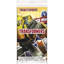 - Fuel up for your party mission with this Transformers plastic Tablecloth. Measuring 84" x 54" and featuring an action-packed design of Bumblebee and Optimus Prime, this plastic table cover will be just the thing for your Transformers birthday party. Spread this Tablecloth out before it's time to eat to keep your table safe from pizza grease and spilled soda. Then, simply throw it away when the party's over for a quick and easy cleanup. Find everything you need for your autobot's big day by shopping all of our Transformers party supplies!