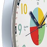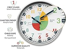 Build Time-Telling Confidence Fast – More than just a clock for kids, this educational learning clock helps children truly understand how time works. Designed to build independence, responsibility, and real-life skills they’ll use every day. Visual Time Sections & Clearly Labeled for Easy Learning – With bright, organized numbers and clearly marked “hour” and “minute” hands, this analog teaching clock makes learning to tell time simple, visual, and frustration-free. Teacher & Homeschool Parent Favorite – Perfect for classrooms, homeschool lessons, and early elementary learners. Teach phrases like “o’clock,” “half past,” and more with a time-learning system that actually makes sense to kids. From Beginner to School-Ready – Ideal for ages 5–7 and beyond. Use as a classroom clock, bedroom learning clock, or playroom teaching tool that supports daily routines and growing independence. 100% Silent for Distraction-Free Learning – No ticking, no interruptions. This quiet analog wall clock helps kids focus, sleep peacefully, and learn without noise distractions.