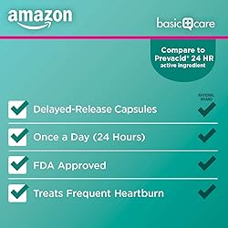 ACTIVE INGREDIENT: Contains lansoprazole 15 mg, an acid reducer; compare to the active ingredient in Prevacid 24 HR HEARTBURN TREATMENT: Delayed-release heartburn medicine, clinically proven to treat frequent heartburn, that painful, burning sensation in the lower chest or throat that occurs when stomach acid backs up ACID REDUCER: When taken as directed, Amazon Basic Care Lansoprazole Delayed Release Capsules, 15 mg reduce heartburn by deactivating acid-producing pumps in the stomach lining to inhibit acid production at the source 14 DAYS: Some people get complete relief within 24 hours; may take 1 to 4 days for full effect; take Amazon Basic Care Lansoprazole Delayed-Release Capsules 15 mg every day for 14 days to treat frequent heartburn (2 or more days a week) SODIUM FREE: Amazon Basic Care Lansoprazole Delayed-Release Capsules 15 mg stops acid production at the source – the pumps that release acid into the stomach.; sodium-free; gluten free; treats frequent heartburn