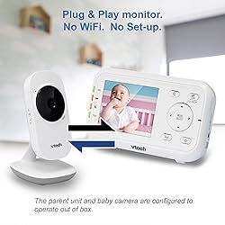 Con una pantalla de alta resolución, el Monitor de video digital para bebé VTech VM3252 de 2.8” te permite ver toda la diversión de tu bebé desde cualquier habitación de la casa. Es fácil ajustar el ángulo de la cámara para que puedas colocarla en cualquier lugar de la guardería y obtener la mejor vista en la pantalla LCD de color de 2.8 pulgadas de la unidad para padres. ¿Tu bebé te necesita? Hazle saber que estás en camino con el intercomunicador bidireccional. Luego ayuda a tu pequeño a estar más cómodo con los sonidos relajantes y las nanas que se reproducen directamente desde la unidad para bebé. El monitor de bebé VTech VM3252 facilita la revisión, incluso durante la siesta. La visión nocturna automática te da una vista clara de la cuna sin perturbar el sueño de tu pequeño. Además, un sensor de temperatura incorporado te informa si se está haciendo demasiado caliente o demasiado frío en la guardería con una alerta en la unidad para padres.