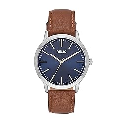 Editor's Notes: Never lose track of time with this men's Relic by Fossil leather watch. The simple features will definitely stand out in your wardrobe. Case & Movement: 40mm case, 20mm band width, scratch resistant mineral crystal, accurate Quartz movement with 3-hand analog display. Dial: Silver, round sleek alloy metal case with a blue dial and silver accents. Watch Band: Brown, genuine leather band with a secure adjustable buckle closure for a customized fit. Water Resistant: Up to 30m (100 ft): Will withstand splashes or brief immersion in water, but not suitable for swimming or showering; 3 ATM.